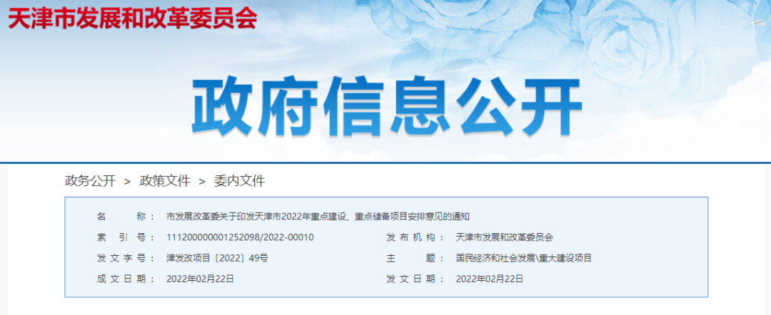2022年2月22日,天津市發(fā)展改革委印發(fā)《天津市2022年重點建設(shè)、重點儲備項目安排意見的通知》,總投資1.8萬億元的676個重點項目清單出爐,投資規(guī)模刷新近年紀(jì)錄。其中包括重點建設(shè)項目452個,總投資1.17萬億元,年度投資2158億元;重點儲備項目224個,總投資6286.7億元。