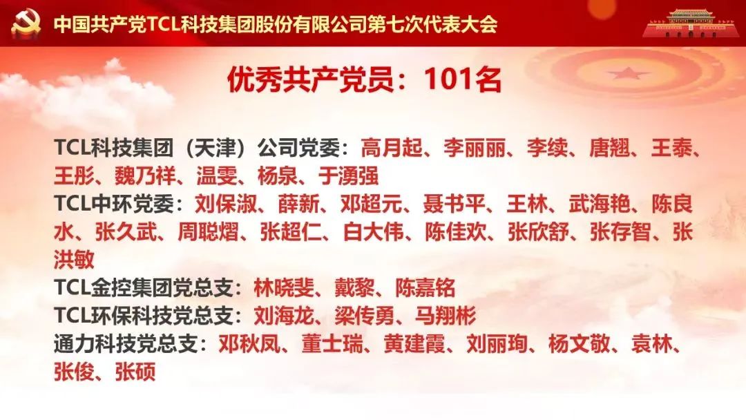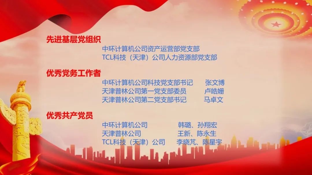 為慶祝七一,表彰先進,經(jīng)TCL科技(天津)公司黨委研究,對先進基層黨組織、優(yōu)秀黨務(wù)工者和優(yōu)秀共產(chǎn)黨員予以表彰。